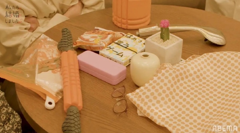 さらにカバンからキャベツスライサー、パーティーゲーム、インスタントのチキンラーメンを取り出したトリンドル。2人の持ち物をテーブルに並べて「ヘンテコ夫婦じゃない?」と浅香に微笑みかけた。