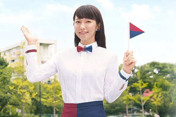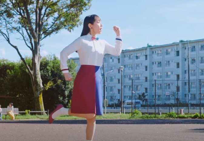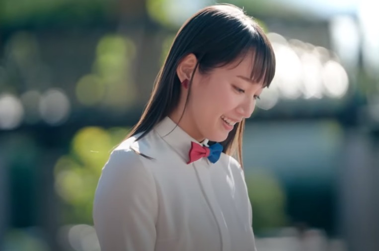 CMで吉岡さんは、これまでの作品と同じように、えんじ色と紺のタイトスカートに、白シャツという爽やかで清潔感あふれる姿を見せています。